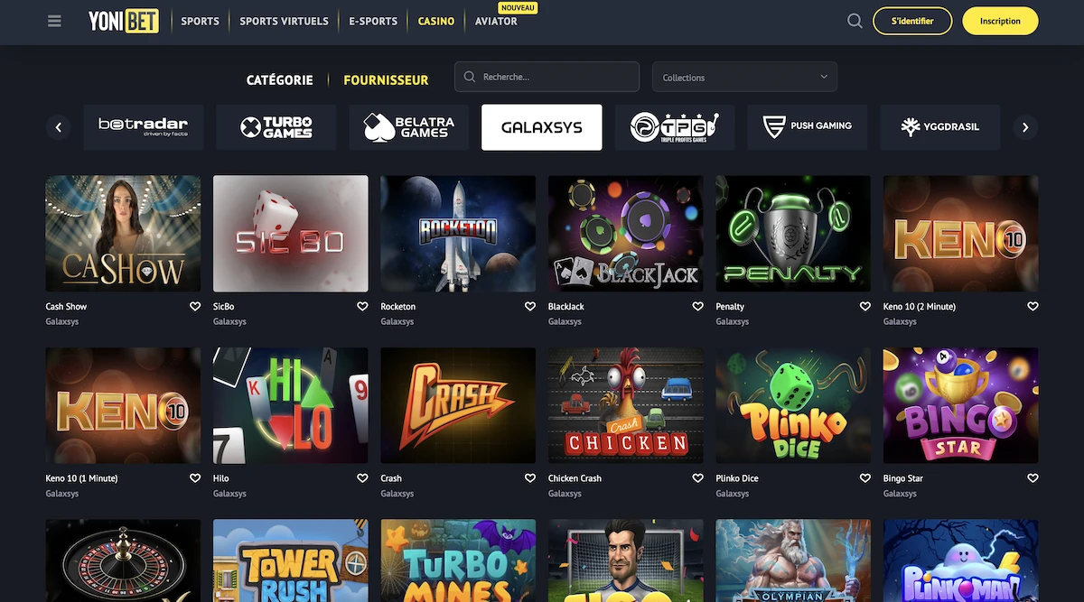La page “Fournisseurs” permet d’afficher directement la sélection Galaxsys, donc vous passez vite de Keno à Crash ou aux mini-jeux de l’éditeur sans perdre de temps.